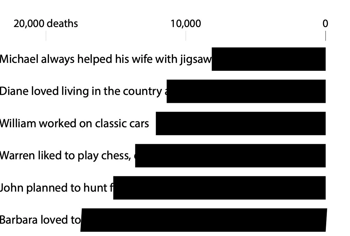 Every victim of covid-19 had their own joys and hopes for the future. Leslie Shapiro and I marked one million deaths in America from covid-19 by writing about one person who died each week of the pandemic: what they loved doing and what they wanted to do next. Each sentence is cut short, as their lives were. The length of each line shows how many other people died from covid-19 that week.