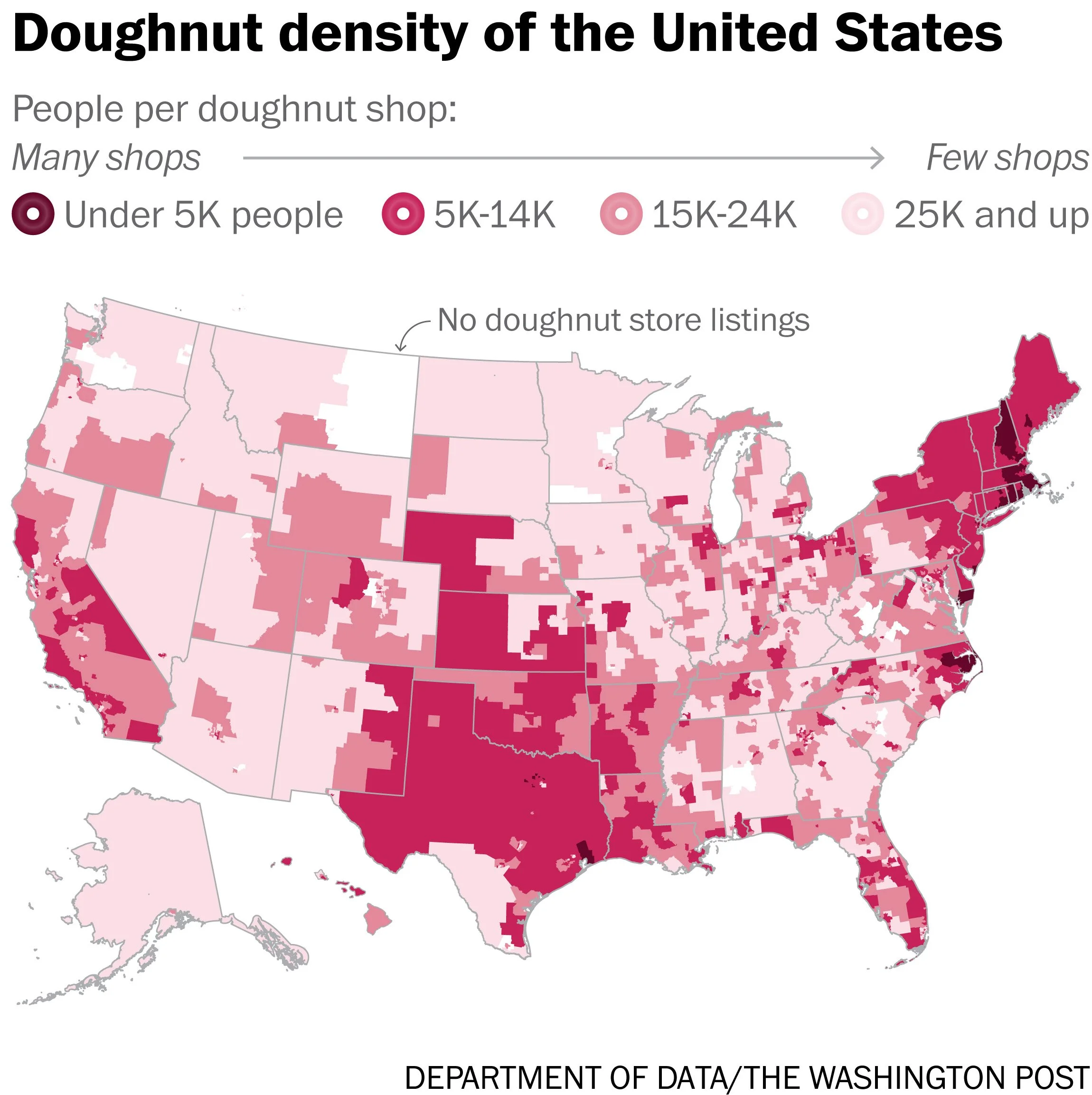 For this story, I requested a list of every donut shop listing in the United States from Yelp. (The Washington Post insists on spelling it “doughnut” in the headline, but I can spell it correctly as “donut” on my own website.) I cleaned and analyzed the data to evaluate the donut density of different areas of the country, what brands were most prevalent in which places, and what was advertised alongside donuts in shop names. One of the big challenges of this story was figuring out how to show geographic information while respecting Yelp’s condition that readers could not back-calculate raw numbers from the story. I solved this by using Public-Use Microdata Areas (PUMAs), a little-known geographic unit that divides the U.S. into blocks with about 100,000 people living in each.