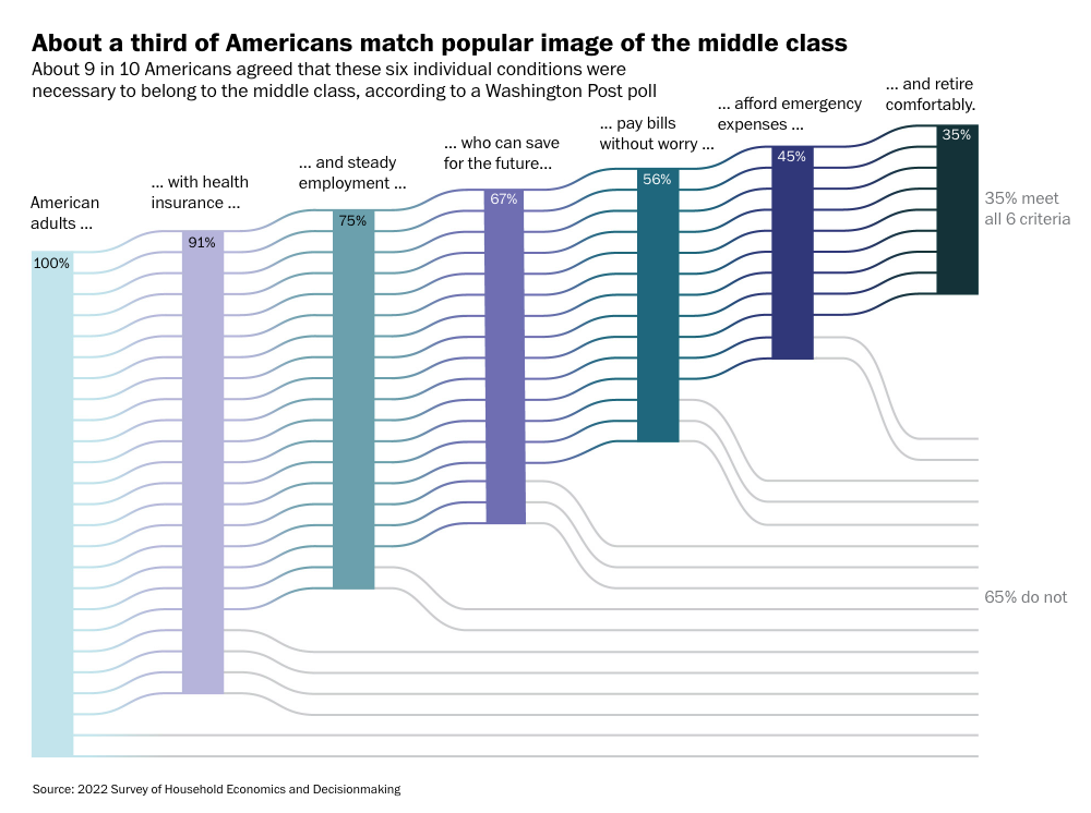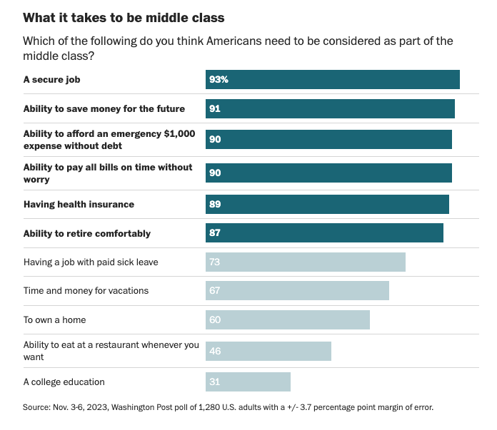 I teamed up with the polling team at The Washington Post to ask a nationally-representative sample of Americans what they thought was necessary to belong to the middle class. There was near-universal agreement on six of the criteria: a secure job, the ability to save money for the future, the ability to afford a $1,000 emergency expense, the ability to pay all bills on time without worry, having health insurance, and the ability to retire comfortably.
