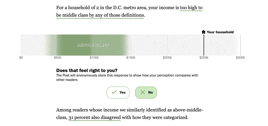 This quiz compared reader incomes to multiple income-based definitions of the middle class, showed how those results changed when taking into account location and family size, and explored reasons why a reader might not feel like they belong to the middle class. The piece compared readers to others in their ZIP code, explored whether that ZIP code was representative of their metropolitan area as a whole, and asked readers questions about their financial security, independently from their income. The quiz ended with an answer to the question “are you middle class” that took into account all of the results and provided an auto-text explanation of the result.