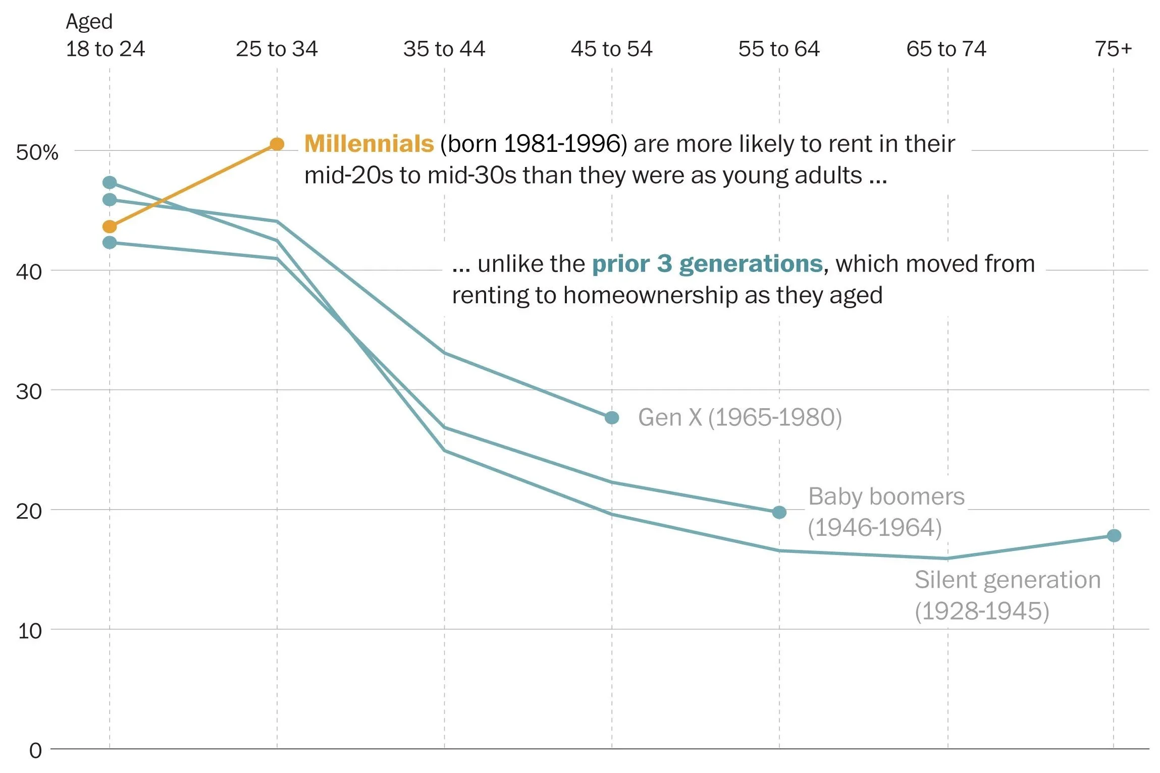 An analysis of 80 years of Census and American Community Survey data showing how millennials are more likely to rent than any other generation at the same age, inspired by the rising age of home-buyers in the United States